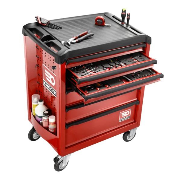Les tiroirs peuvent être équipés de tous les modules thermoformés ou mousse du programme Facom Modular system (Capacité de 15 modules répartis dans les tiroirs de 60 et 130 mm, Les tiroirs de 200 peuvent également recevoir des modules.)