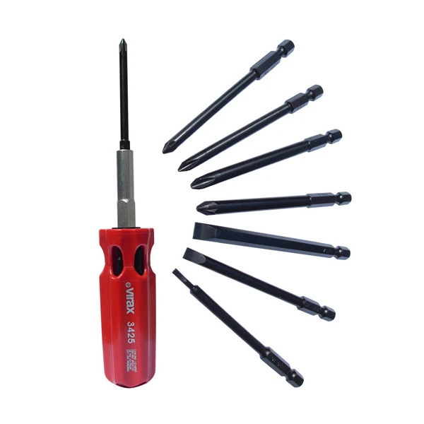Tournevis virax avec porte-embout long permettant le vissage de vis difficiles d’accès, idéal pour les interventions difficiles. Tous les embouts sont stockés dans le manche evitant ainsi la perte de ceux-ci. Maintien magnétique des embouts et disponibilité immédiate de chaque empreinte. Lame entièrement fraisée.